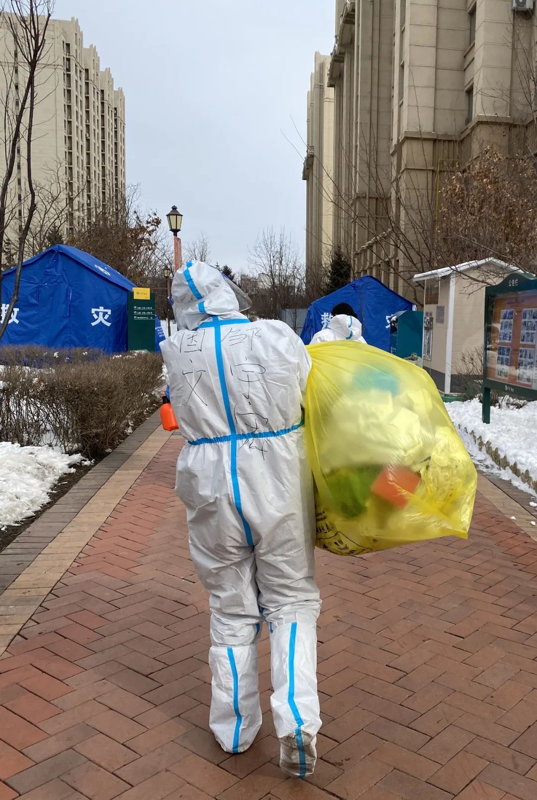 時間還未過去一個月,當(dāng)我還沉浸在失去至親的痛苦中時,了解到疫情防控工作到了嚴(yán)重缺乏醫(yī)療人員的時期,主動請纓,擦干眼淚,收拾行囊,加入進疫情防控一線隊伍。我知道,這是我的使命,我與核醫(yī)學(xué)科護士團隊十人一往無前奔向抗疫前線。在漫天大雪紛飛中,大家一起穿著厚重的防護服前往九臺,在狹小的封控區(qū),與同事們互相一遍遍檢查防疫服穿戴規(guī)范后,馬不停蹄地展開我們的工作。