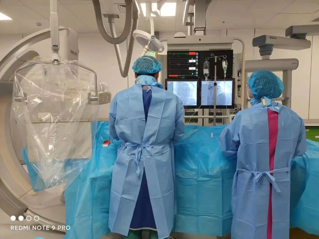經(jīng)家屬同意,22時(shí)28分,患者轉(zhuǎn)運(yùn)至導(dǎo)管室,開始實(shí)施急診PCI手術(shù)?;颊咴谘茉煊跋嘛@示見降支中段90%狹窄,右冠后降支95%狹窄,幾乎沒有血流,隨時(shí)可能發(fā)生不測,所幸的是國文醫(yī)院胸痛中心,流暢快速的運(yùn)行機(jī)制,手術(shù)及時(shí)、血管開通及時(shí)、心肌供血恢復(fù)及時(shí),讓患者成功得救,并順利度過危險(xiǎn)期。同來的另一名患者也被收入心內(nèi)科的隔離病房,給予及時(shí)有效治療,情況良好。