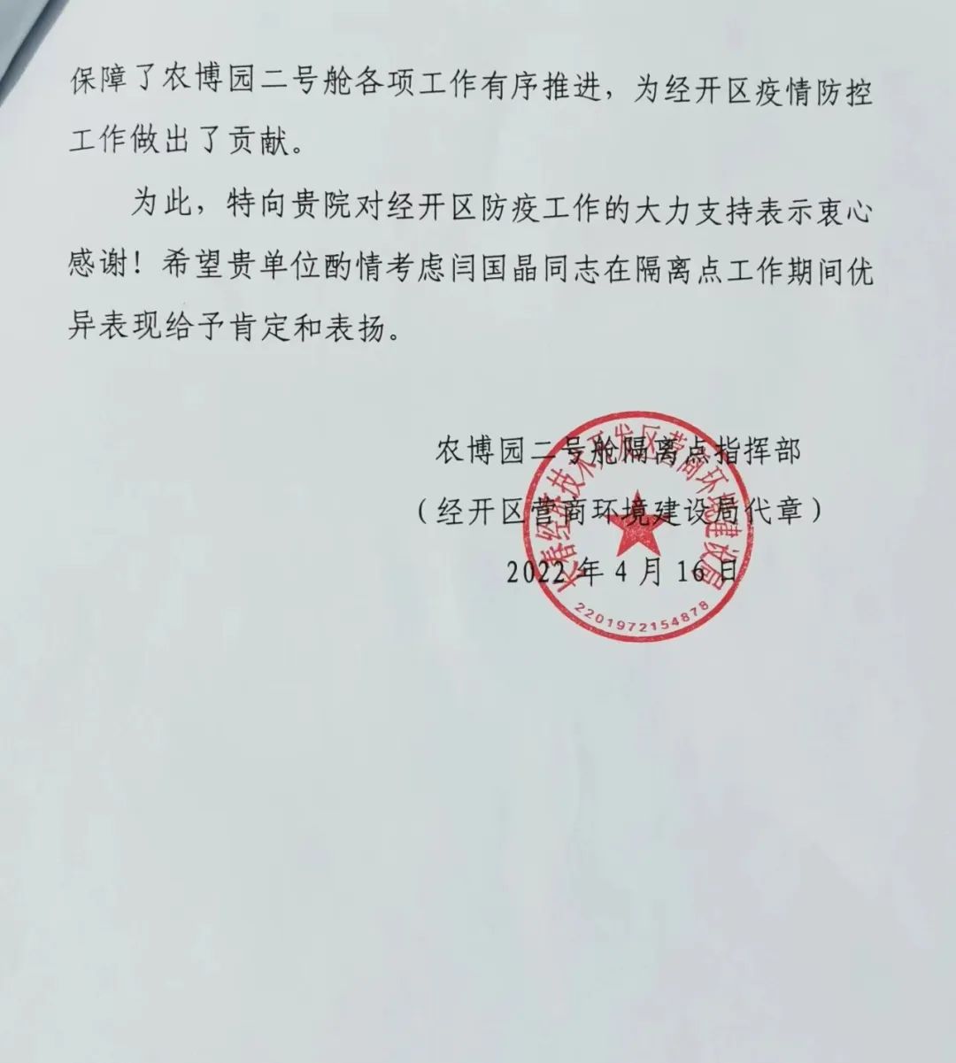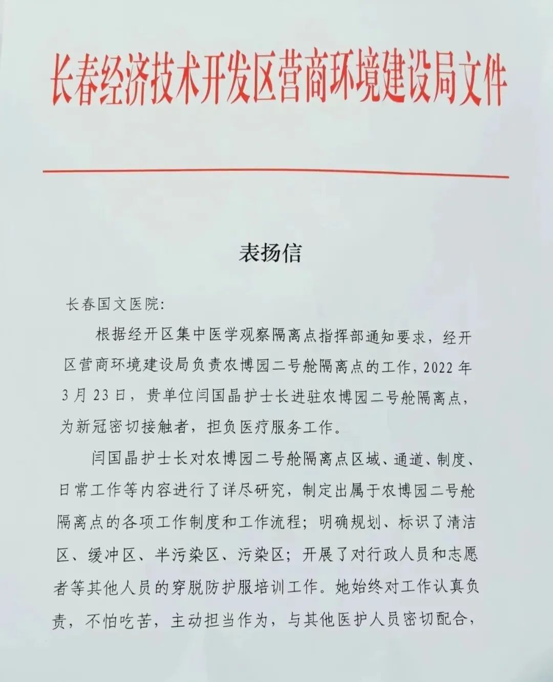 在來信中,長春經(jīng)濟技術(shù)開發(fā)區(qū)營商環(huán)境建設(shè)局高度贊揚了我院介入科閆國晶護士長,她始終對工作認真負責,不怕吃苦,主動擔當作為,與其他醫(yī)護人員密切配合,保障了農(nóng)博園二號艙各項工作有序推進,為經(jīng)開區(qū)疫情防控工作做出了貢獻。