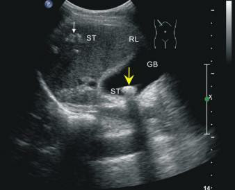 這位先生姓錢,自訴飲酒后出現(xiàn)胸骨后疼痛4小時(shí),呈壓榨性,持續(xù)不緩解,伴大汗、面色蒼白、惡心、欲吐,既往無(wú)高血壓、糖尿病、冠心病病史,吸煙史30年,偶有飲酒,入院時(shí)查體血壓為120/80mmHg,心率:98次/分,節(jié)律規(guī)整,未聞及明顯雜音。心電圖:竇性心律,心率98次/分,II、III、aVF導(dǎo)聯(lián)病理性Q波,ST段下移,不正常心電圖。不除外急性心肌梗死。急檢心肌酶及超敏肌鈣蛋白、淀粉酶,結(jié)果回報(bào)心肌酶、超敏肌鈣蛋白無(wú)明顯改變。疼痛時(shí)復(fù)查心電圖較前無(wú)變。胸痛癥狀仍持續(xù)不緩解,給予曲馬多止痛不改善。請(qǐng)示李桂武主任醫(yī)師,主任給予詳細(xì)詢問病史、癥狀及查體,患者膽囊區(qū)有壓痛無(wú)反跳痛,考慮患者可能存在膽囊性疾病,不排除腎結(jié)石,指示:急檢肝膽胰脾彩超及泌尿系彩超。我急忙陪著患者及家屬去門診彩超室做肝膽胰脾及泌尿系彩超。結(jié)果如下圖。提示膽囊結(jié)石。