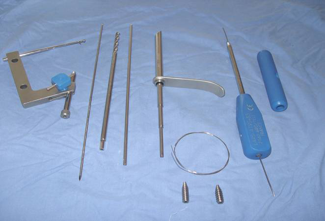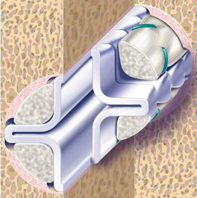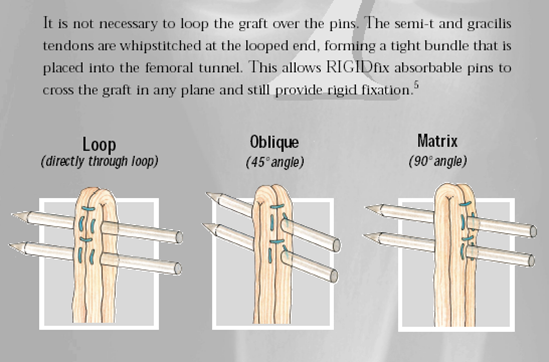 Rigidfix-Intrafix 固定。Rigidfix為PLLA可吸收螺釘。Intrafix是將擠壓釘置于釘鞘內(nèi),防止螺釘對(duì)移植物的直接損傷,同時(shí)達(dá)到360度固定,其材料為CP/PLA,具有誘導(dǎo)成骨和可吸收性