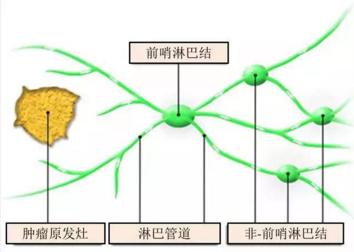 前哨淋巴結是原發(fā)腫瘤區(qū)域淋巴結中的特殊淋巴結,是原發(fā)腫瘤發(fā)生、淋巴結轉移所必經(jīng)的第一批淋巴結。