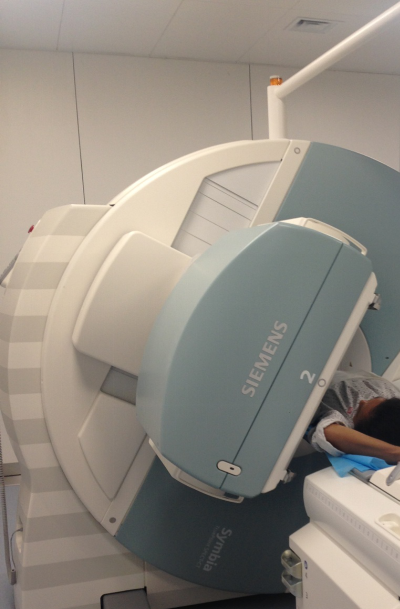圖2 患者正在進行前哨淋巴結顯像上機檢查