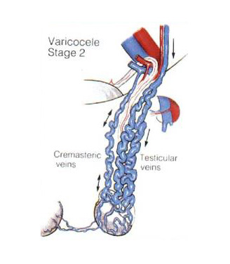 精索靜脈曲張得到很多人關(guān)注的原因是,它常常會(huì)伴有睪丸萎縮和精子生成障礙,嚴(yán)重情況下會(huì)導(dǎo)致不育。目前對(duì)重度的精索靜脈曲張的治療以手術(shù)為主,主要采用精索內(nèi)靜脈高位結(jié)扎術(shù)。下圖為精索靜脈曲張II度示意圖: