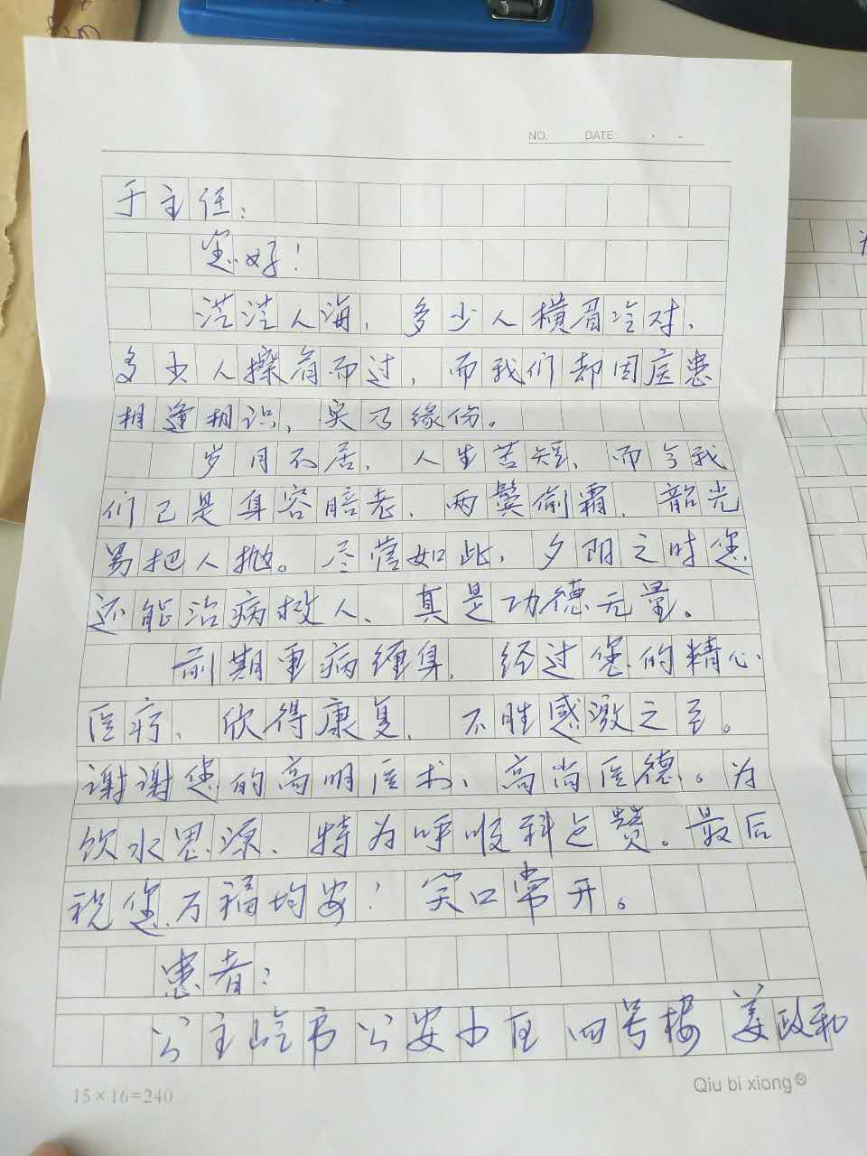 我科主任工作這么多年,收過的錦旗和表揚(yáng)信數(shù)不勝數(shù),從未收過患者的紅包,可他從未驕傲,依然盡心竭力的工作著,把自己的經(jīng)驗(yàn)分享科室醫(yī)生,讓醫(yī)生學(xué)習(xí)到更多,更好地為患者診治。
