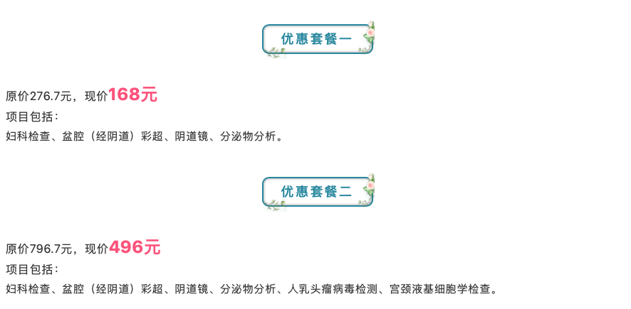 門診檢查優(yōu)惠項目:婦科內(nèi)診、陰道分泌物分析、宮頸癌前篩查(宮頸液基細(xì)胞學(xué)檢查、宮頸人乳頭瘤病毒檢測)、盆腔(經(jīng)陰道)三維彩超、進(jìn)口電光一體電子陰道鏡等。針對不同個體差異進(jìn)行不同套餐選擇。
