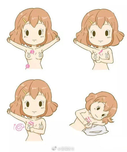 以上這些動(dòng)作可在洗澡時(shí)用涂有肥皂滑液的手反復(fù)進(jìn)行,自檢時(shí)切忌抓捏