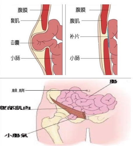 3.無(wú)張力修補(bǔ)術(shù):利用人工高分子材料網(wǎng)片進(jìn)行修補(bǔ),此方法術(shù)后疼痛存在、恢復(fù)相對(duì)快、復(fù)發(fā)率略低,但有潛在排異和感染的危險(xiǎn),對(duì)局部條件差的患者要慎用。