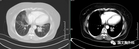 因病灶位置關(guān)系經(jīng)過支氣管鏡檢查未能明確病理,病灶包裹著血管CT穿刺風(fēng)險巨大。