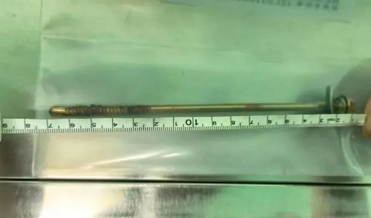 在完善周密的術(shù)前準(zhǔn)備后,手術(shù)馬上進(jìn)行,由王曉主任親自主刀,開胸探查后發(fā)現(xiàn)螺栓頭部已經(jīng)刺破右肺上葉,胸腔內(nèi)出血400ml。慶幸的是,穿刺物與主動脈與肺動脈,都擦肩而過,沒有傷及大動脈。由于穿刺物緊貼大血管,手術(shù)需要格外小心,術(shù)中經(jīng)過充分瘺道消毒、胸腔消毒,充分止血,歷時一個半小時,成功取出異物。張先生推出手術(shù)室的一刻,一直守在手術(shù)室外的家屬終于放下心來,激動地握住王曉主任的手,不斷重復(fù)地說著感謝!感謝!