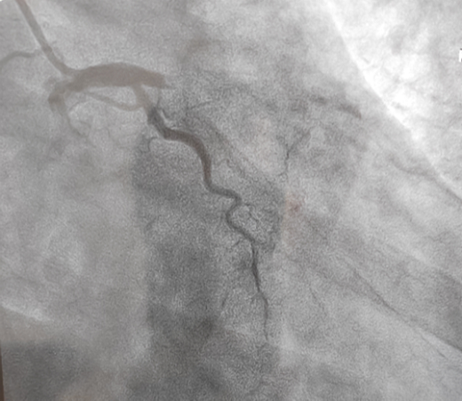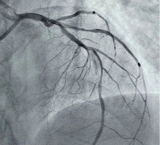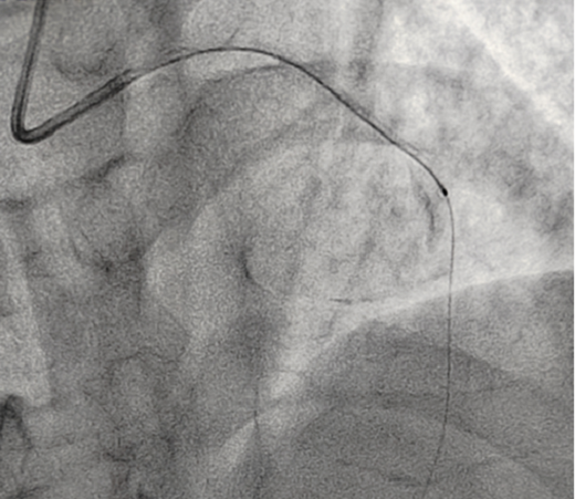 立即啟動綠色通道,急診冠脈造影,結(jié)果顯示前降支近段閉塞,血栓負(fù)荷較重,先后給予血栓抽吸及球囊擴(kuò)張,血流恢復(fù)正常。李桂武主任和劉興剛主任發(fā)現(xiàn)患者近段狹窄達(dá)70%,且中遠(yuǎn)段嚴(yán)重狹窄伴鈣化,此時不適合同期植入支架,如植入支架可能會引發(fā)血管破裂危及生命。當(dāng)務(wù)之急是快速評估出患者是否可以下手術(shù)臺,選擇擇期進(jìn)行處理,但僅根據(jù)造影結(jié)果又很難做出判斷,李桂武主任和劉興剛主任快速討論研究最后一致決定,給予患者行冠脈OCT檢查,明確病變性質(zhì)。