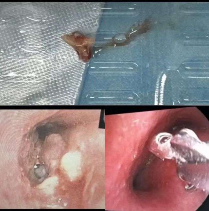 近日,一名9歲男孩魚骨誤入氣管,當時未在意,超過24小時后出現咳嗽咳痰癥狀,縣級醫(yī)院無法取出,前來長春國文醫(yī)院就診。急診麻醉下,呼吸內科劉曉峰主任聯合麻醉醫(yī)師給予全麻內鏡下明確魚骨位置,鏡下見魚骨已經與支氣管內膜侵襲,形成感染,給予嘗試活檢鉗探取,最終取出魚骨。