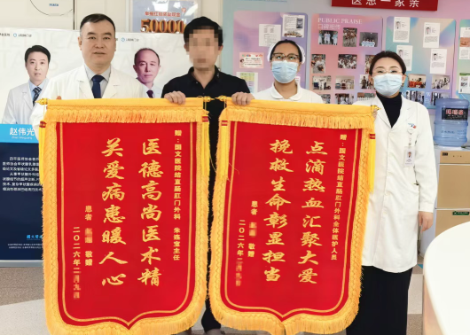 近日,國文醫(yī)院結(jié)直腸肛門外科聯(lián)合多學(xué)科協(xié)作,成功為胃腸雙重腫瘤患者精準(zhǔn)施治,為患者生命點亮希望,得到家屬和患者一致認(rèn)可,為表達感謝,患者及家屬特意將兩面錦旗鄭重送到醫(yī)護人員手中。錦旗上的鎏金字跡,不僅承載著患者及家屬對科室醫(yī)護人員的深厚敬意,更見證了一段跨越重癥、凝聚醫(yī)患深情的暖心救治之路。