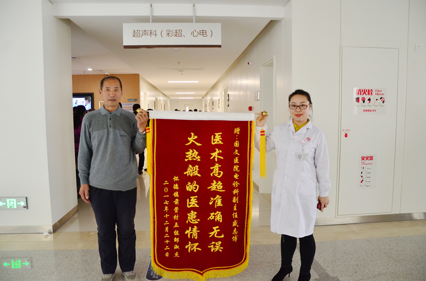 患者加護田文龍說,患者是腎結(jié)石疾病,在來我院之前,在鄉(xiāng)下的醫(yī)院做了彩超,沒查出來。來我院盛主任給查出來了,之前就有多次彩超是盛志博主任給做的,非常好。之前還不太相信盛主任,后來去醫(yī)大又做的,跟盛主任檢查的一樣,盛主任做的檢查,真的很準確。解釋的清楚明白,百問不厭,患者用十六個字概括“醫(yī)術(shù)高超,準確無誤,血熱般的醫(yī)患情懷”,患者打算給盛主任做一面錦旗。