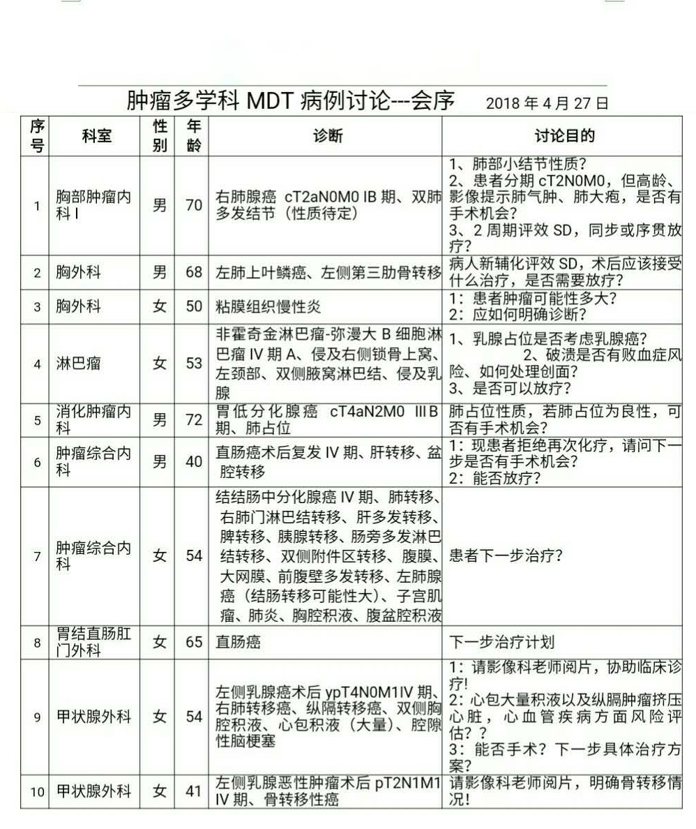 4月27日下午2:30在門診五樓中層會(huì)議室進(jìn)行“腫瘤多學(xué)科MDT病例討論。各科室出席人數(shù)按照《MDT制度及實(shí)施細(xì)則》執(zhí)行,請(qǐng)各位遵守。 入場(chǎng)時(shí)間不得早于2:00