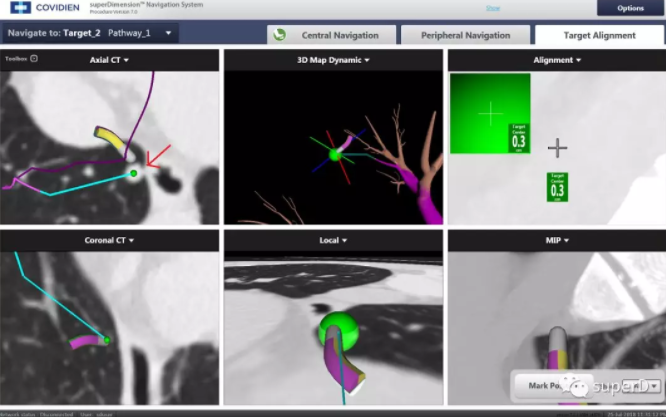 吉林國文醫(yī)院胸外科主任介紹,電磁導(dǎo)航支氣管鏡的導(dǎo)管前端設(shè)置了傳感器,向放置在患者胸部的3個磁極和病人身下的電磁定位板發(fā)射信號,如同在患者肺部的GPS導(dǎo)航系統(tǒng)。在常規(guī)支氣管鏡無法深入檢查的情況下,該設(shè)備可以由探頭引導(dǎo)進入更深入的支氣管內(nèi)部,直至肺泡,進行活檢取樣、病灶標記定位和微創(chuàng)消融治療。