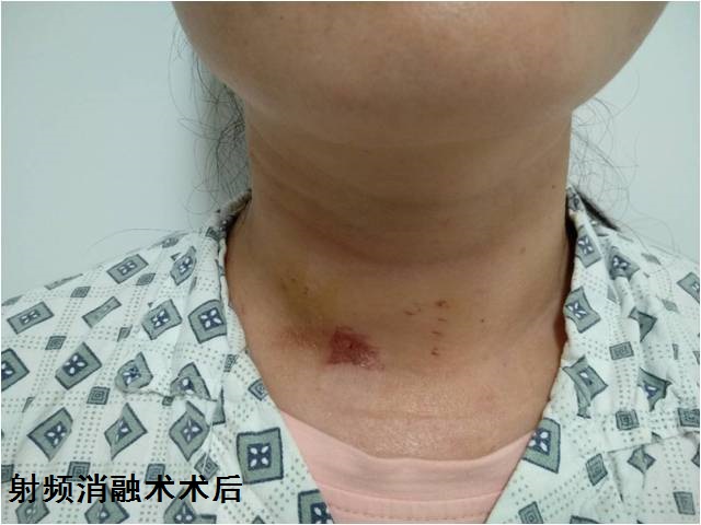 呂**,發(fā)現(xiàn)頸前腫物2月余。本院甲狀腺彩超檢查報(bào)告:甲狀腺右葉前后徑1.6cm,腺體中部探及結(jié)節(jié)大小約1.5*2.2cm,低回聲結(jié)節(jié),邊界清,左葉前后徑0.9cm,雙葉腺體回聲略紊亂。雙側(cè)頸鞘及鎖骨上區(qū)探及多枚扁平淋巴結(jié)。檢查結(jié)果:甲狀腺結(jié)節(jié)--右葉;甲狀腺?gòu)浡圆∽儯谞钕傺??)符合射頻消融手術(shù)適應(yīng)癥。給予在靜脈復(fù)合麻醉下行超聲引導(dǎo)甲狀腺右葉腫物射頻消融術(shù)。術(shù)后恢復(fù)良好。今日術(shù)后第一天,患者無(wú)明顯不適,活動(dòng)自如,飲食正常,頸部未見(jiàn)明顯瘢痕。