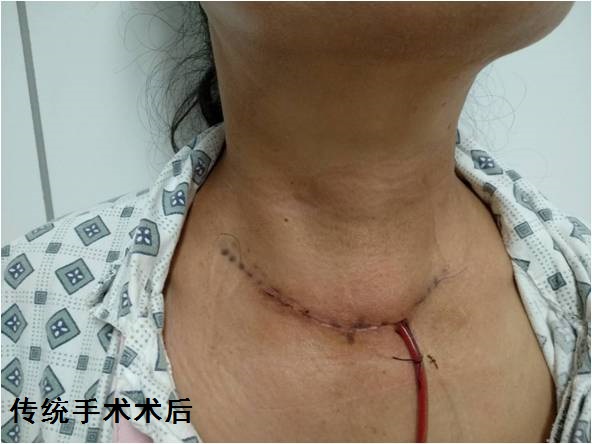 譚**,女,33歲。在我院行甲狀腺彩超結(jié)果示:右葉下極探及2.9*2.1cm囊性結(jié)節(jié),形態(tài)規(guī)則,邊界清晰,CDFI:周邊及內(nèi)部可見(jiàn)血流信號(hào),余腺體內(nèi)可見(jiàn)多發(fā)結(jié)節(jié)回聲,較大者:右葉下極1.0*0.8cm混合回聲結(jié)節(jié),左葉下極0.6*0.5cm混合回聲。甲狀腺雙葉結(jié)節(jié)。符合射頻消融手術(shù)適應(yīng)癥。給予在靜脈復(fù)合麻醉下行超聲引導(dǎo)下甲狀腺右葉結(jié)節(jié)射頻消融術(shù)。手術(shù)過(guò)程順利術(shù)后患者恢復(fù)良好。今日術(shù)后第三天,現(xiàn)患者已活動(dòng)自如,飲食如常,頸部未見(jiàn)明顯瘢痕。