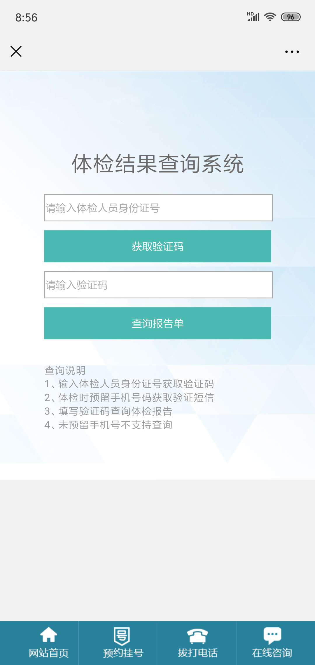 注:體檢報(bào)告查詢系統(tǒng)>可查詢最近一次體檢報(bào)告,體檢時未預(yù)留手機(jī)號碼無法查詢