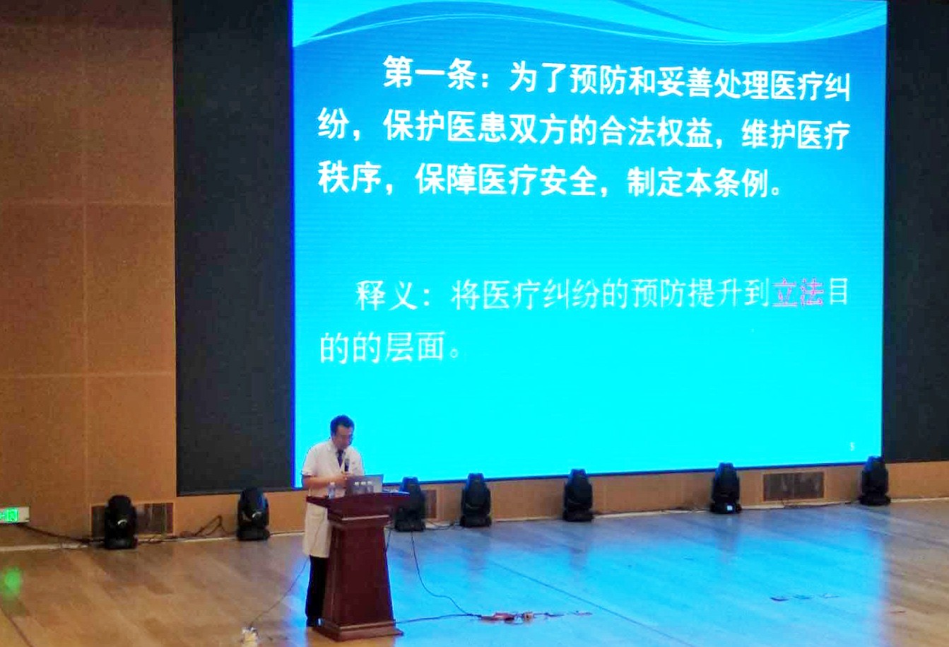 大會(huì)第六項(xiàng)議程,為進(jìn)一步規(guī)范醫(yī)務(wù)人員的醫(yī)療行為,預(yù)防醫(yī)療風(fēng)險(xiǎn),保障醫(yī)療安全,由醫(yī)務(wù)處劉寶安處長(zhǎng)對(duì)全體參會(huì)醫(yī)師進(jìn)行了《醫(yī)療糾紛預(yù)防和處理?xiàng)l例》專題培訓(xùn),培訓(xùn)會(huì)上,劉寶安處長(zhǎng)從總則、醫(yī)療糾紛預(yù)防、醫(yī)療糾紛處理以及法律責(zé)任四個(gè)方面,對(duì)條例進(jìn)行了細(xì)致、系統(tǒng)的分析和解讀,對(duì)條例中有所變化的重點(diǎn)內(nèi)容進(jìn)行了強(qiáng)調(diào)。重點(diǎn)強(qiáng)調(diào)此次出臺(tái)的《條例》將預(yù)防醫(yī)療糾紛提升到立法層面,對(duì)醫(yī)療機(jī)構(gòu)和醫(yī)務(wù)人員提出了更高要求,特別是在保障患者的知情權(quán)、選擇權(quán)方面,對(duì)醫(yī)務(wù)人員告知的內(nèi)容、方法、告知的對(duì)象等,做了詳細(xì)的規(guī)定,從源頭上預(yù)防醫(yī)療糾紛的發(fā)生。